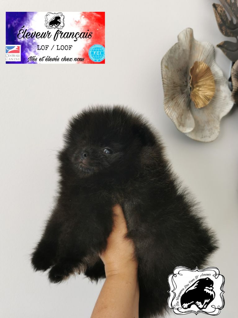 Mini male noir pomeranain très typé compact et court petit nez et large.
